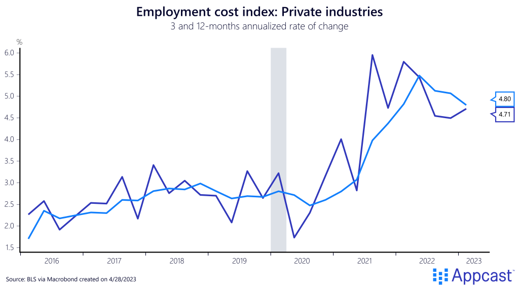 The first quarter Employment Cost Index (ECI) showed as much this morning – earning growth is not slowing but remains hot even as the rest of the economy sputters. The ECI is the most comprehensive measure of wage growth, as it adjusts for the composition of the workforce. While the ECI was slowing over twelve months, looking at the three-month annualized rate shows more trouble. The three-month percent change at an annualized rate was at 4.7%, indicating that the upward pressure on wages was strong last quarter. This will worry the Fed.