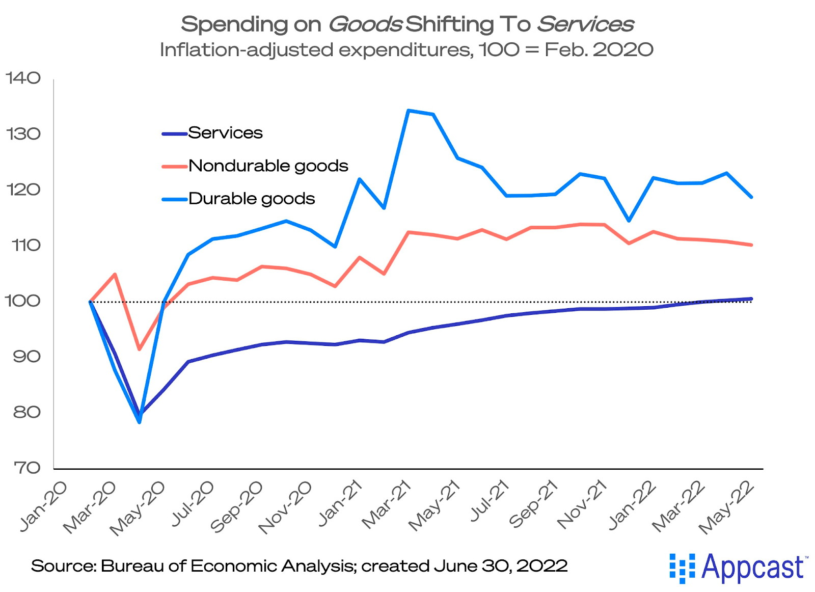 After a long hiatus from services spending, consumers have recently reached pre-pandemic levels of spending on services, and in May, this trend continued. At the very beginning of the COVID-19 pandemic, consumer spending on services dropped dramatically and though it has been gaining since, each variant flare led to modest drops. This May increase was driven by spending on housing and international travel. Consumers are still making up for a pandemic-driven lack of services and May did not disrupt this trend.