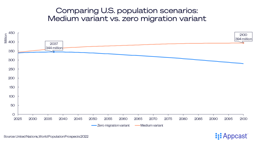 The importance of immigration for the United States becomes even more apparent when examining different population scenarios. In the United Nations prospected scenario excluding immigration, the U.S. population would reach its peak of 344 million people in 13 years already before starting to decline, mirroring trends seen in many Western European countries that have already started to shrink despite their increasing migration rates. These countries face challenges related to workforce shortages, economic growth, and sustaining social welfare systems. However, with continued migration, the U.S. population is projected to approach 400 million people by the end of the century, with no population decline in sight. Given this perspective, immigration is a vital factor in sustaining population growth and demographic stability in many aging countries.