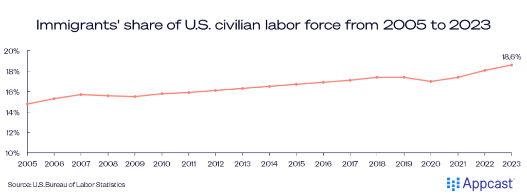 Immigration plays a vital role in the U.S. economy. Despite a significant slowdown in immigration flows to the United States following policy changes from 2017 to 2020 and the pandemic, immigrants’ share of the U.S. civilian labor force has steadily risen for over a decade, increasing from 14.8% to 18.6% by October 2023. In 2022, immigrants represented 29.2% of the workforce in construction, 21.3% in professional and business services, 20.5% in leisure and hospitality, and 14.3% in educational and health services. According to data from the U.S. Bureau of Labor Statistics, the participation rate of foreign-born men in the labor force was even higher, at 77.4%, compared to their native-born counterparts at 66.0%. Immigration has evolved into a fundamental part of the United States and, despite presenting certain challenges, benefits the economy.