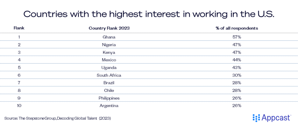 When examining the countries of origin for individuals displaying the highest interest in working in the U.S., respondents from Ghana, Nigeria, Kenya, and Mexico stand out with the strongest inclination to relocate.
