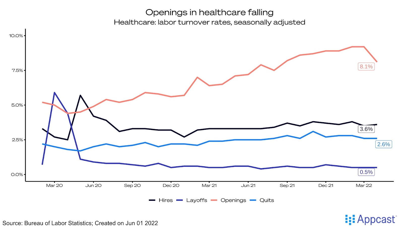 A higher job openings rate (which is calculated by dividing the number of job openings by the sum of total employment and job openings) signals a stronger demand for workers. How employers actually translate openings into hires – that’s the hires rate. A more challenging recruiting environment emerges when the gap between the opening rate and hiring rate grows (holding retention constant). However, retention is not constant: the quits rate measures the willingness of workers to leave their job, often because they got a better offer elsewhere. So, a high quits rate is a sign of a strong labor market. The layoffs rate is the inverse: the lower it is, the stronger the labor market, but in recessions, layoffs rise.