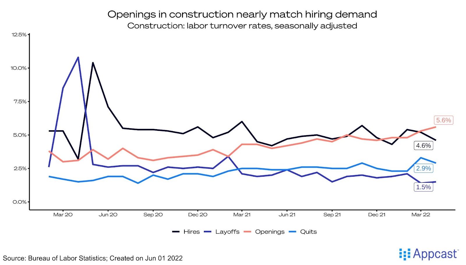 Construction, funnily enough, has had a good balance between openings and hires over the last year, with quits typical. Now a slight increase in openings over hires has emerged.