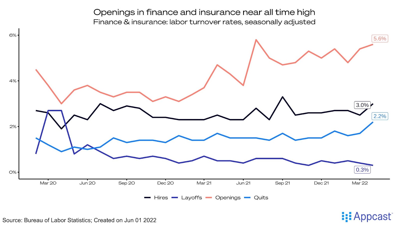 Finance & insurance job openings are near an all-time high, while quits have been rising (the “Great White Collar Resignation”?). Layoffs are not happening.