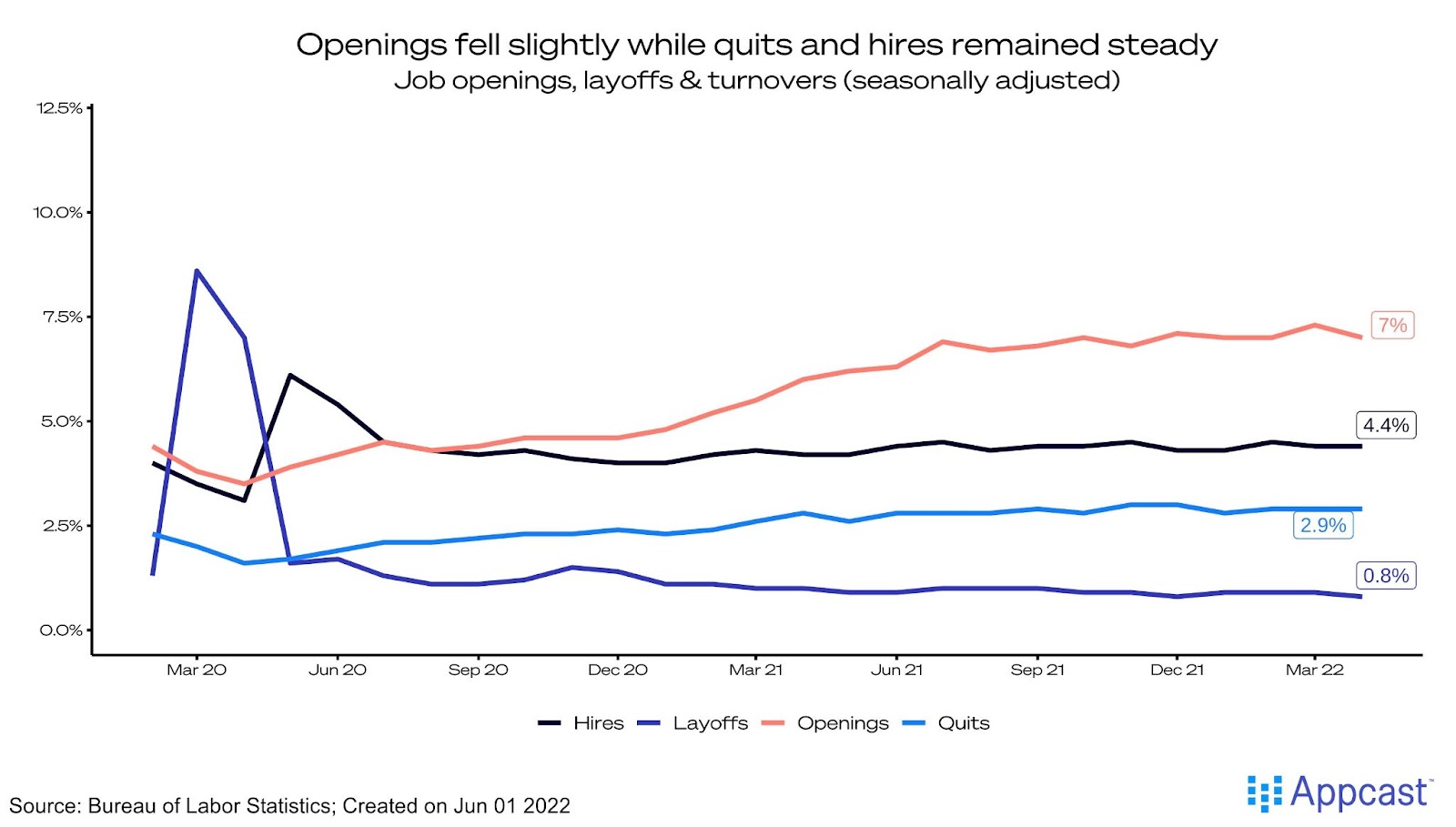 Quitting remained elevated, but the “Great Resignation” isn’t getting worse (for now). Let’s take a tour through the latest April release of the Job Openings and Labor Turnover Survey (JOLTS) report.