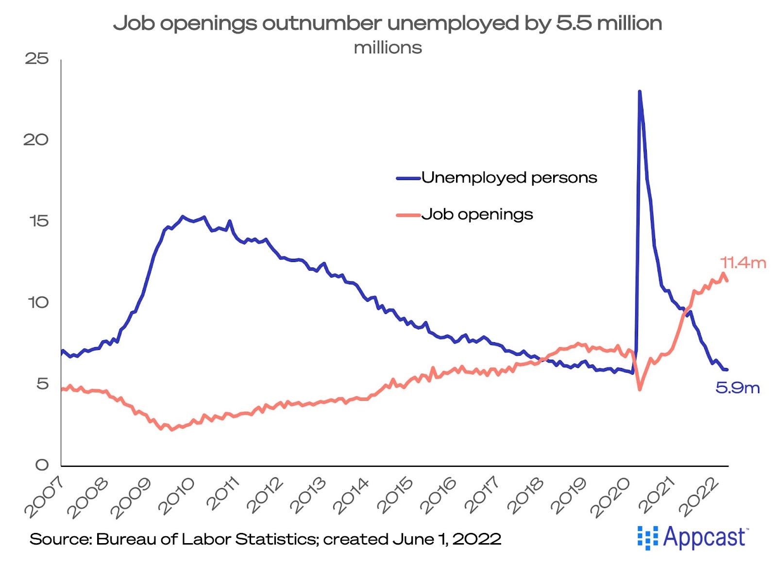 Job openings declined in April to 11.4 million from an all-time high of 11.9 million in March. This level is about 60% above the pre-pandemic number of job openings. And while the gap between unemployed persons (5.9 million) and openings closed a bit, it’s still very wide at 5.5 million. There is a fundamental imbalance in this ‘tight’ labor market: more demand for workers than the supply of hireable candidates.