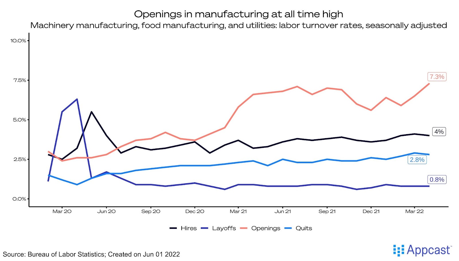 Manufacturing job openings have never been higher – more than double the level pre-pandemic and growing. The hiring rate (4%) just can’t keep up. Quits are average in this sector.