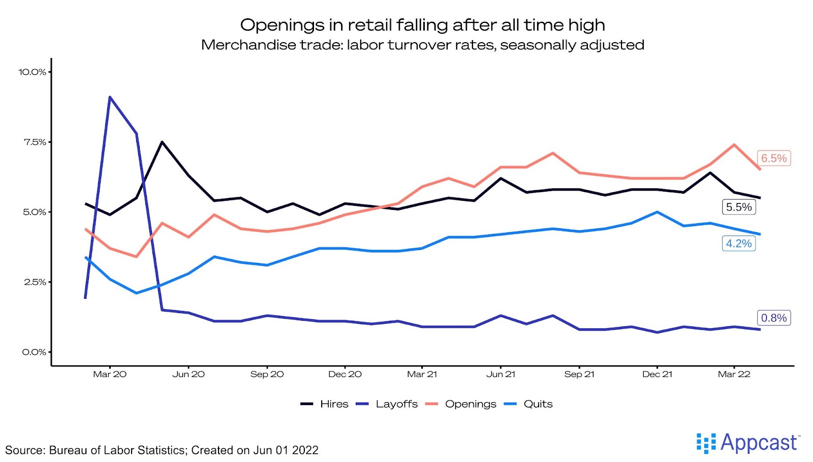Retail, comparatively, has a much smaller gap between its openings and hires rates. Quits are much higher (no surprise).