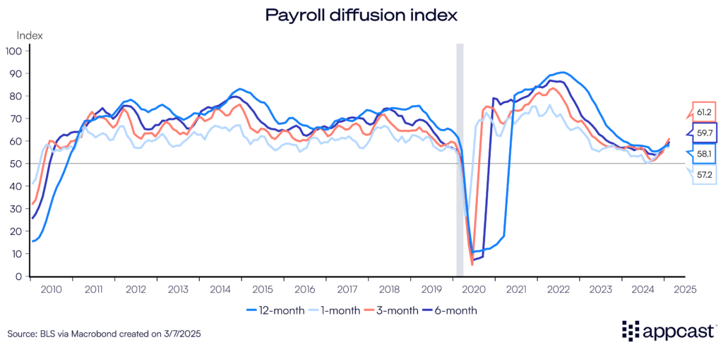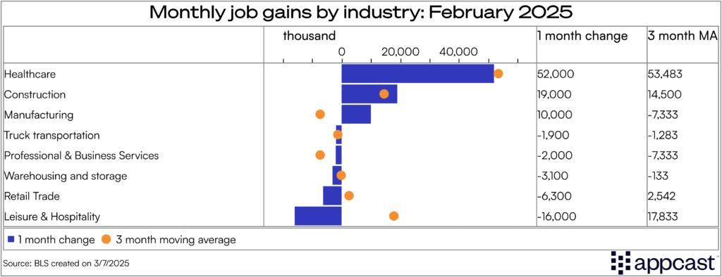 Healthcare is still the leading sector in job growth, making up a third of total employment growth in February. This is no surprise; healthcare has been the powerhouse of the labor market for the past few years, even as other industries have stumbled. However, other sectors showed up last month as well. Construction, information, and transportation all posted growth, continuing to rebound from a slow summer in 2024.