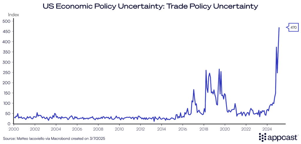 The first two months of President Trump’s new administration have been a whirlwind of policy changes. Just this week, for example, broad-based tariffs on Mexico and Canada were enacted and subsequently revoked in just 48 hours. These abrupt changes, on top of the wide-reaching efforts by the Department of Government Efficiency (DOGE) to reduce the federal workforce, are causing a sharp increase in economic uncertainty.