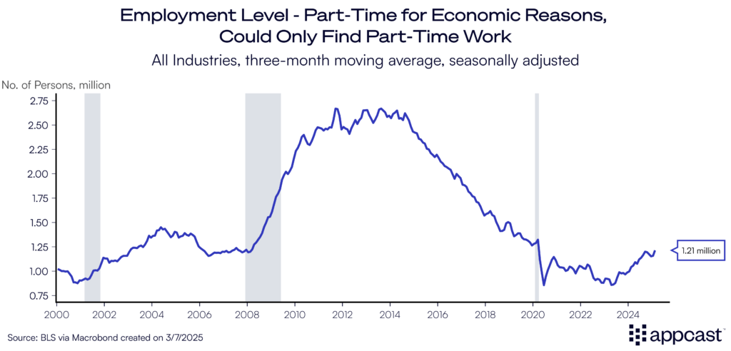 One potential warning sign is the steady rise of part-time workers that would rather have full-time work, termed “part-time for economic reasons” by the Bureau of Labor Statistics. Either these workers’ hours were reduced, or they were unable to secure full-time employment. Employers may decide to cut back hours or reduce full-time hiring in response due to the economic environment, a potential leading indicator of future labor market weakness.