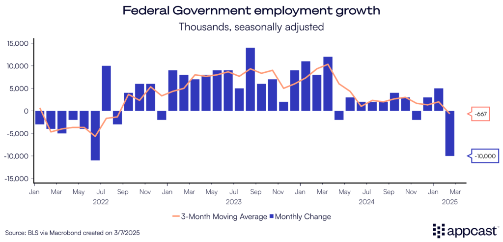 The second is that DOGE’s efforts to reduce the size of the federal workforce are materializing: employment in the federal government fell by 10,000 last month. This is the largest one-month drop since June of 2022. On Thursday, the Department of Labor’s unemployment claims data (a proxy for layoffs) also indicated that over 1,600 Federal workers filed new claims. The full impact of this initiative will take many months to unfold in the data – but this is the first sign of what’s to come.
