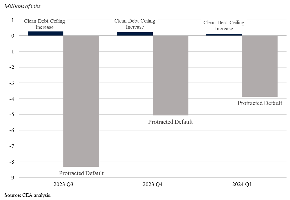 “In 2023 Q3, the first full quarter of the simulated debt ceiling breach, the stock market plummets 45 percent, leading to a hit to retirement accounts; meanwhile, consumer and business confidence take substantial hits, leading to a pullback in consumption and investment. Unemployment increases 5 percentage points as consumers cut consumption and businesses lay off workers.”