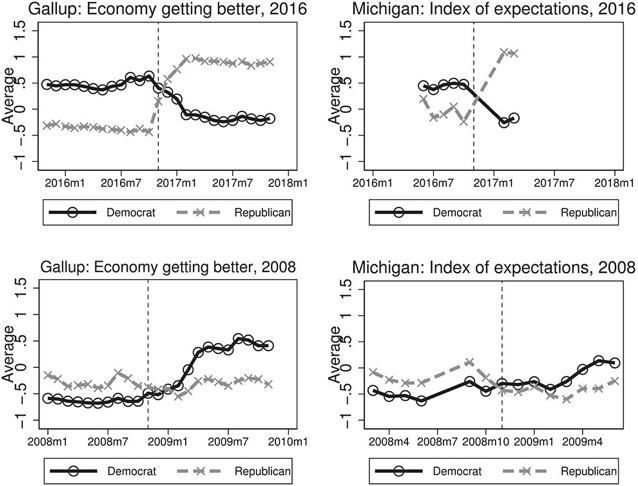 Academic research just published this month by Atif Mian, Amir Sufi, and Nasim Khoshkhou took this a step further. They linked this well-known partisan bias on views of the economy to surveys of economic expectations that are often used by forecasters to predict a recession. The chart below shows surveys from Gallup and the University of Michigan about economic expectations before and after January 2017, when President Donald Trump took office. Not much about the economy changed over one month. But partisan opinion flipped.