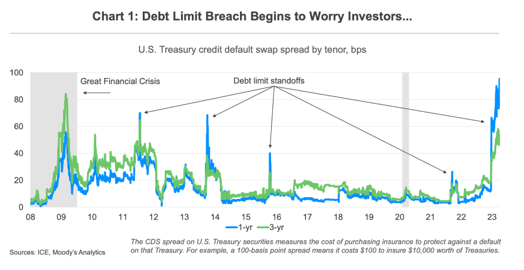As Moody’s Analytics has analyzed in detail, the mere threat of a debt limit breach is spooking investors. The chart below shows rising credit default swap spreads for U.S. Treasury bonds – effectively, the cost of insuring against a debt default. As investors begin to hedge their risk of the unthinkable (default), rising credit costs can spill over into wider financial market turbulence.