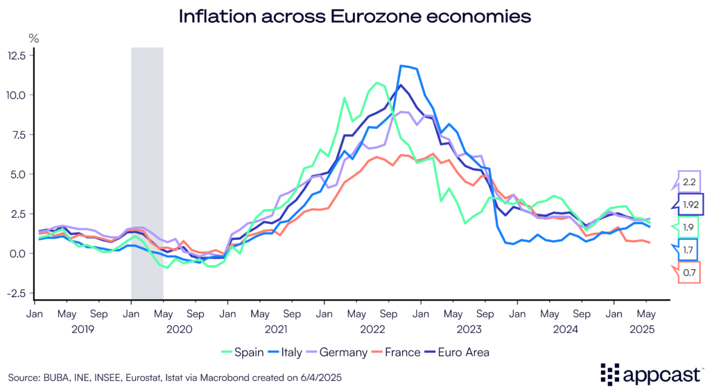 Less than three years after inflation peaked at over 10% in October 2022, the Eurozone is now facing deflationary risks. The economy has slowed dramatically, and inflation just fell below target. More concerning, the labor market is deteriorating. Job growth is stalling, and wage growth is expected to come down sharply. With geopolitical risks being extremely elevated and the U.S. trade war weighing on economic activity, the European Central Bank (ECB) may be inclined to lower interest rates this week (with more rate cuts to come later this year), otherwise risk an economic and labor market slowdown that will weigh on job creation and wage growth.