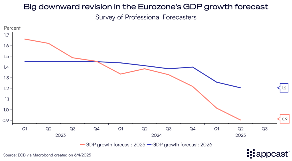The GDP growth forecast for 2025 has been revised down significantly since the middle of last year, from about 1.4% to just 0.9%. Similarly, the growth projection for 2026 has declined from about 1.4% to 1.2% over the same time. The Eurozone economy is thus facing an economic slowdown this year while global economic uncertainty has risen to an all-time high, mostly a result of U.S. trade policy.