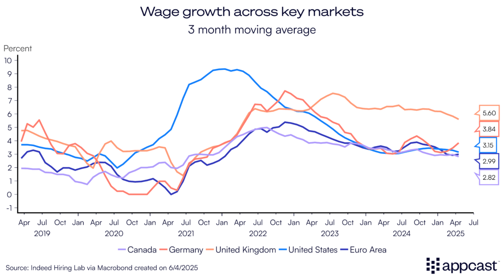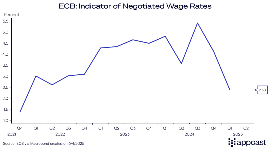 Though the ECB has been cutting rates, it has been a slow and deliberate process. A key objective to quicker rate cuts was historically elevated wage growth in 2023 and 2024 that added to inflationary pressures.