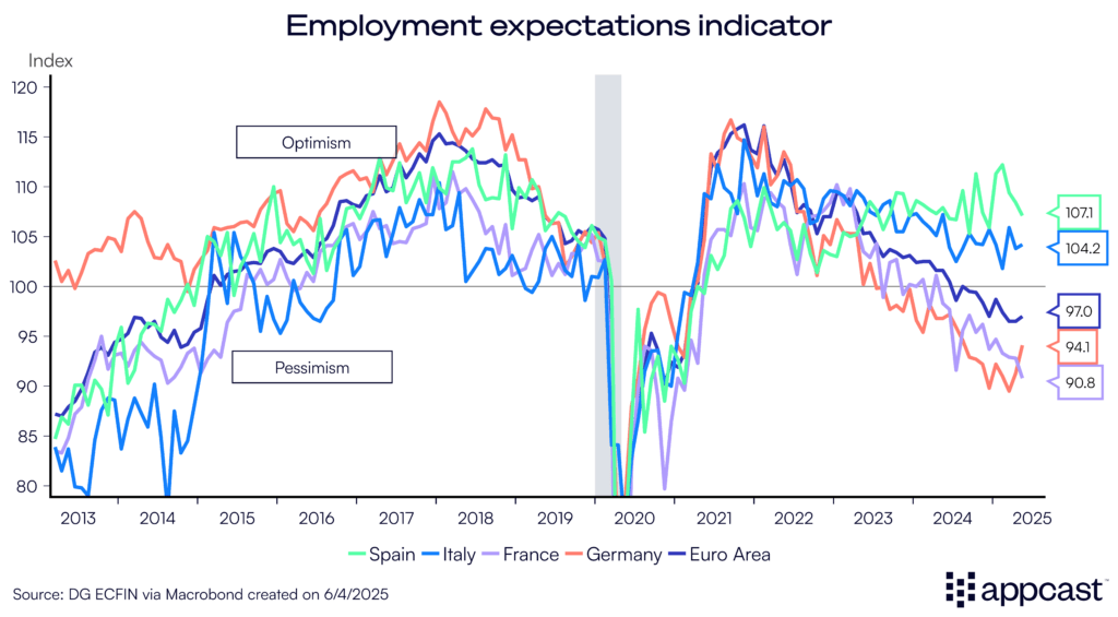 The employment expectation indicator is a survey-based measure that asks managers about their expectation for employment changes in the near future. Any reading below 100 points towards caution and pessimism in terms of job growth. While managers in Italy and Spain feel optimistic about employment growth, Germany, France, and the Eurozone have seen a clear and rapid deterioration over the last year.