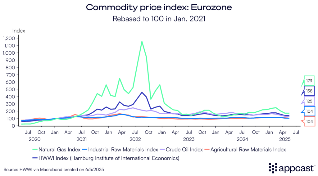 One big driver of the Eurozone’s inflation problem was the massive surge in commodity prices back in 2022. While the hot labor market and economic stimulus coming out of the pandemic also contributed, there is no doubt that European economies suffered tremendously from the commodity price shock that followed Russia’s invasion of Ukraine.