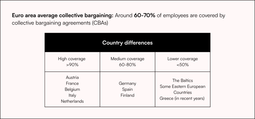 While there are some stark differences across countries, approximately 60 to 70% of all Eurozone employees are subject to collective bargaining agreements. Tracking these collective bargaining agreements can therefore give you an early indication of future wage growth.
