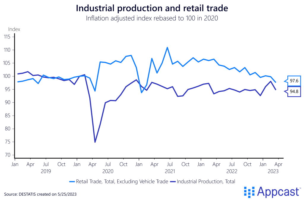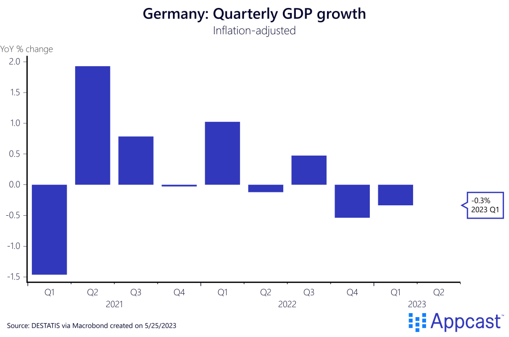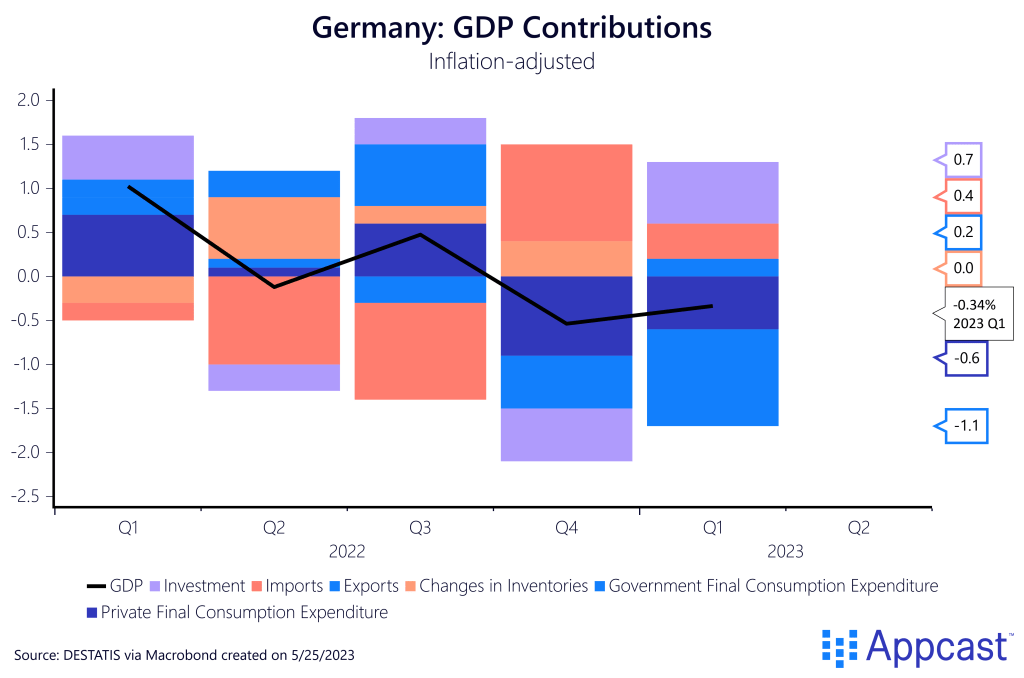 In the U.S., the recession dating committee from the NBER is responsible for determining whether the economy is in a contraction or not; in Europe, the rule-of-thumb of two consecutive quarters of negative GDP growth is widely used. By that measure, Germany is now in a technical recession: The economy contracted by about 0.5% in Q4 of 2022 and 0.3% in Q1 of 2023 and is now down by about 0.5% from last year.