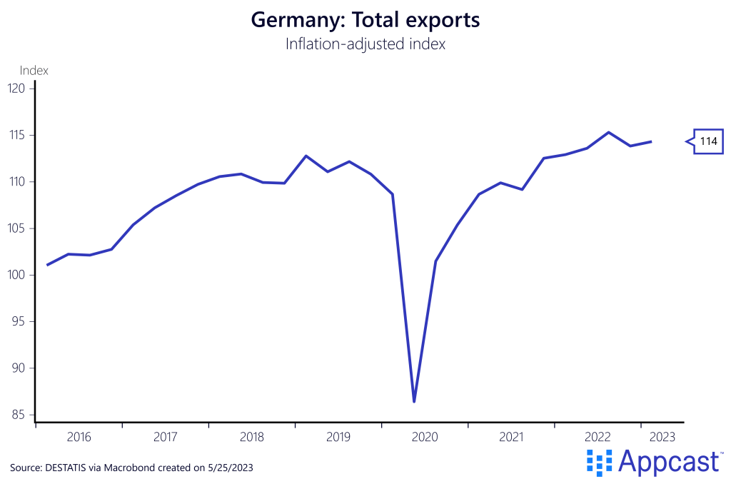 While German exports to the rest of the world recently reached a new record high of more than 500 billion euros in Q4 of 2022, almost all of the increase is due to a price effect and not a volume effect: On an inflation-adjusted basis, German exports are not much higher than at the end of 2019.