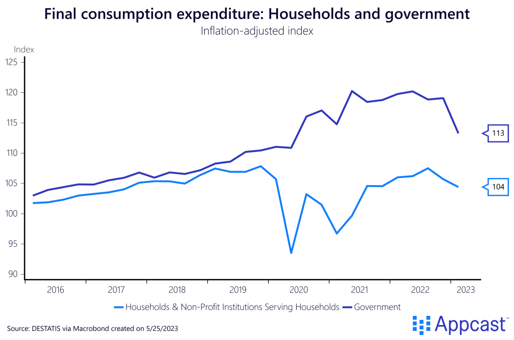 More interesting though is that the German government is now reducing its expenditures by a significant amount. Government consumption expenditures are down by more than 5% year-over-year, with most of the decline happening in Q1 2023.