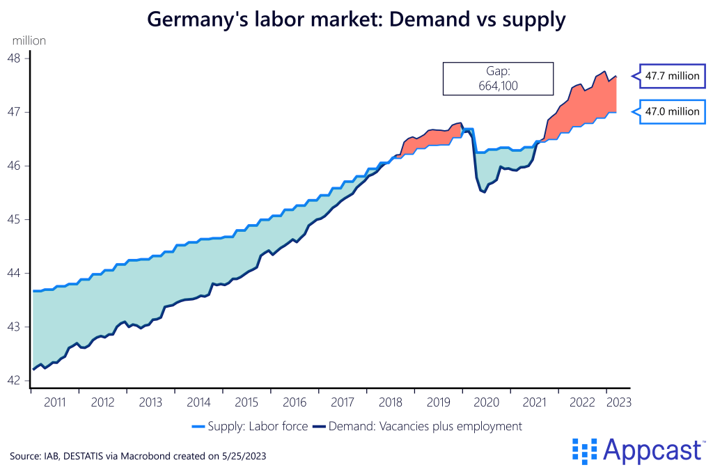 Despite the weakening economy though, Germany’s labor market is still suffering from a massive worker shortage as adverse demographics are starting to take their toll. According to our estimates, the demand for workers is still exceeding the available supply by more than 600,000 and many companies are still reporting a skilled-worker shortage that will not disappear any time soon, even with a mild downturn.