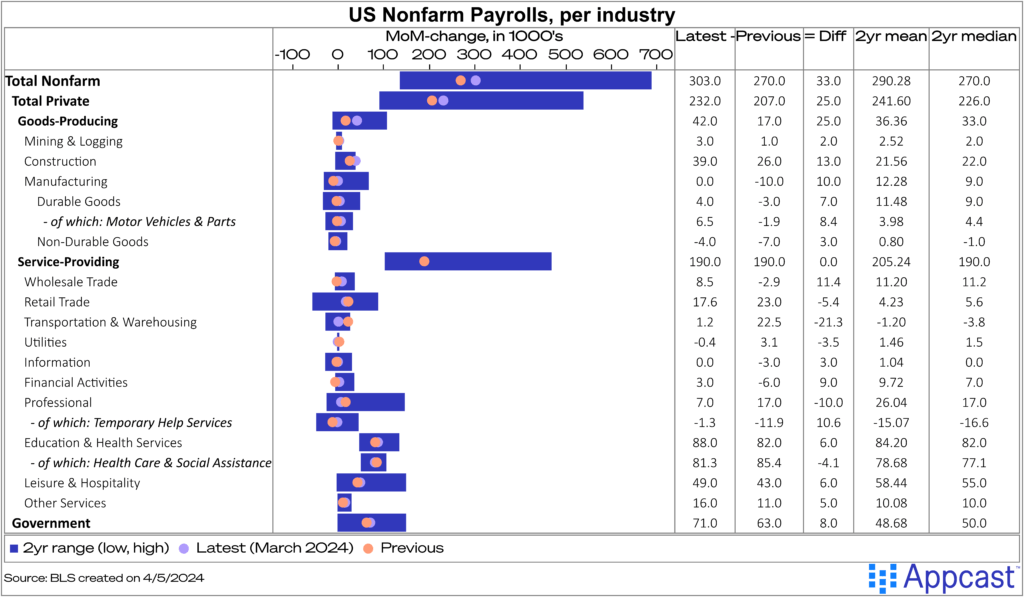 The headline employment gain of 303,000 in March (once again) blew past expectations. Bloomberg, for example, surveyed 74 economists and this top-line figure was higher than every single economist’s forecast. The 3- and 6-month trends have started to reaccelerate. So, this is more “no landing” than “soft landing.”