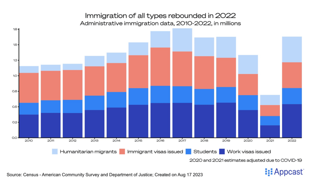 Perhaps the most significant change was the strong return of work visas – 543,000 were issued in 2022. The number of job openings in the U.S. is still elevated, and these work visas are an important part of growing the economy by plugging the gaps in the labor market.