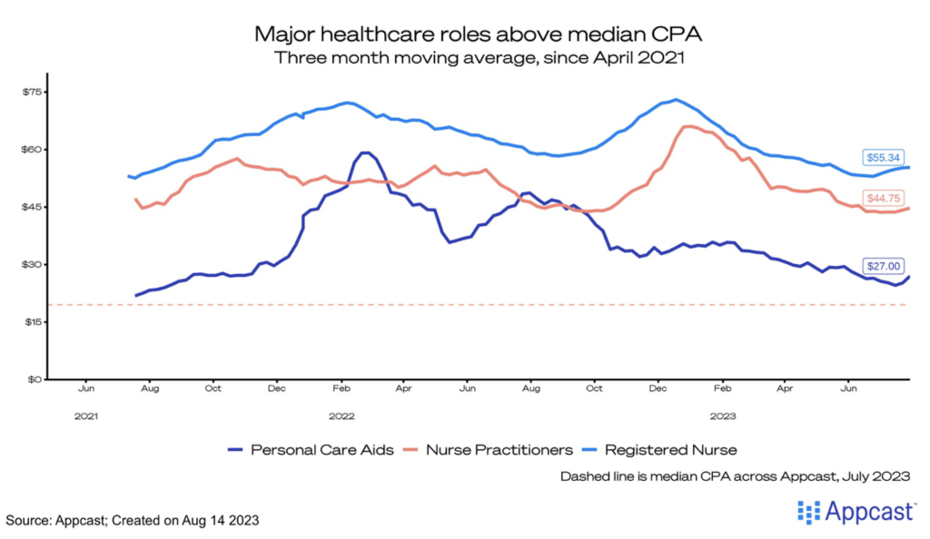 The empirical work done in academic research also materializes in Appcast data on recruiting costs. The cost-per-application (CPA) for healthcare workers has been notoriously high, particularly for nurses and personal care aides. Despite a broad softening in the labor market over the past six months, these roles are still hard to fill.