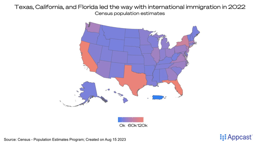 When 2022’s immigration data is broken down by state – an interesting pattern appears. Most states had international immigration growth but Florida, California, and Texas led the way with a combined 368,000 new residents. These states also had a significant GDP boost in 2022, with Texas far above with an annual growth rate of nearly 15%! Booming economies fuel the demand for labor and the substantial boost in immigration surely helped.