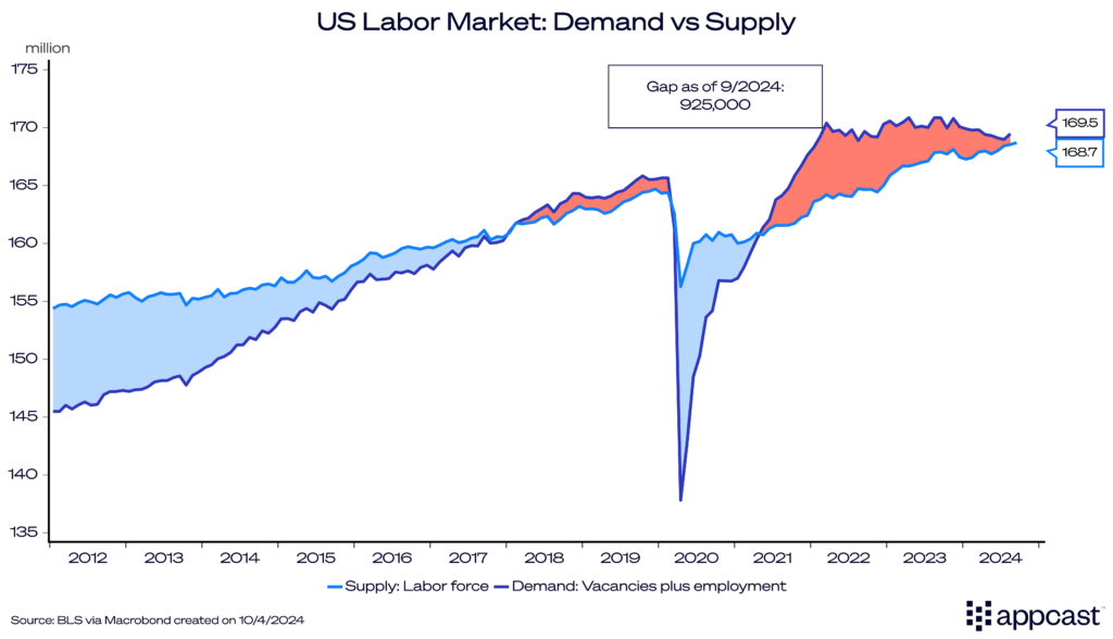 As supply has steadily risen and demand has cooled, the labor market is at nearly perfect balance. We see this in our go-to approximation of supply and demand: