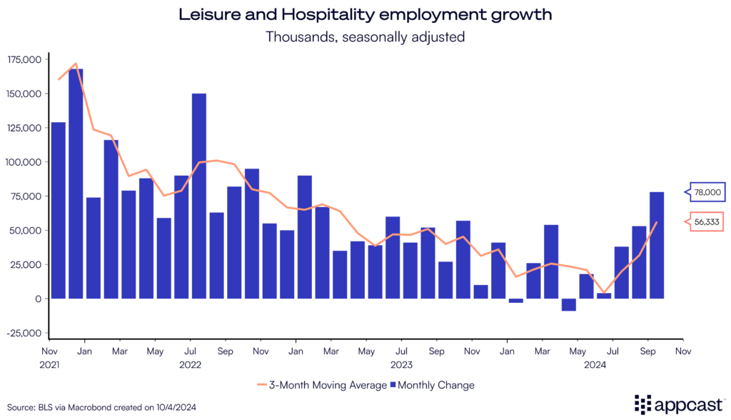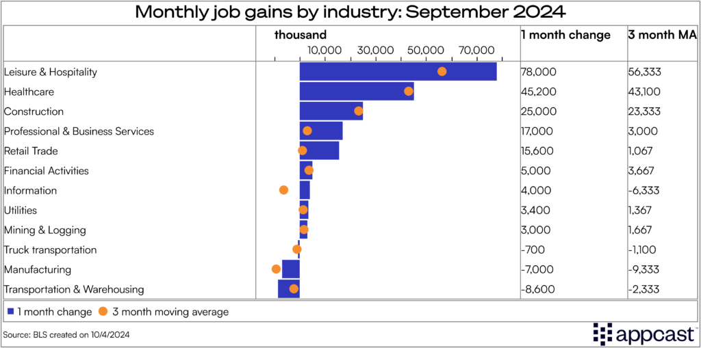 After falling into the doldrums earlier this year, leisure and hospitality jobs have been on a tear recently. In September, the industry led with 78,000 jobs added. Healthcare can be described as solid. It added 45,000 net new jobs in September – gains are not as strong in this powerhouse sector as they once were, but it remains a boon for overall gains. Construction has remained steady, adding 25,000 net new jobs.