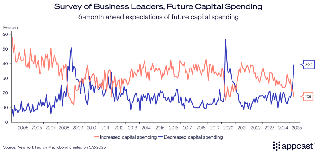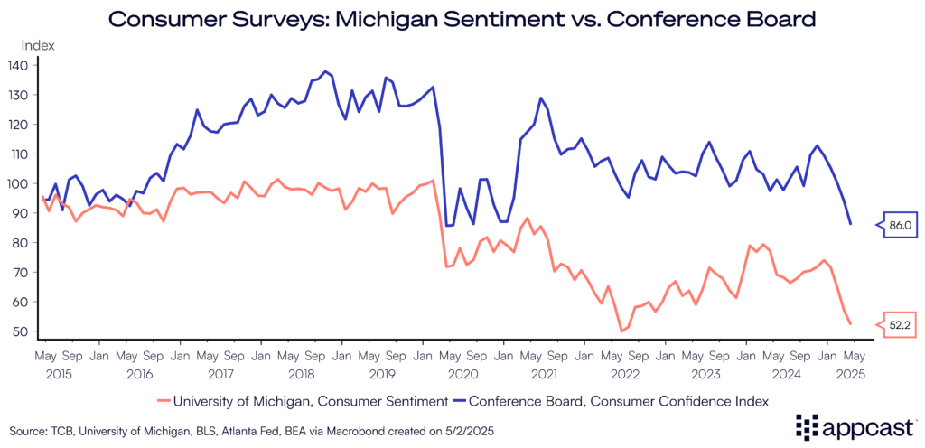 For recruiters, this jobs report indicates that hiring demand across the economy was mostly stable in April. Those working in transportation, warehousing or logistics may have experienced a recent spike in competition as hiring picked up in the first quarter. Yet, the soft data highlighted shows a worrying sign—businesses and households may begin to change their purchasing and investment habits.