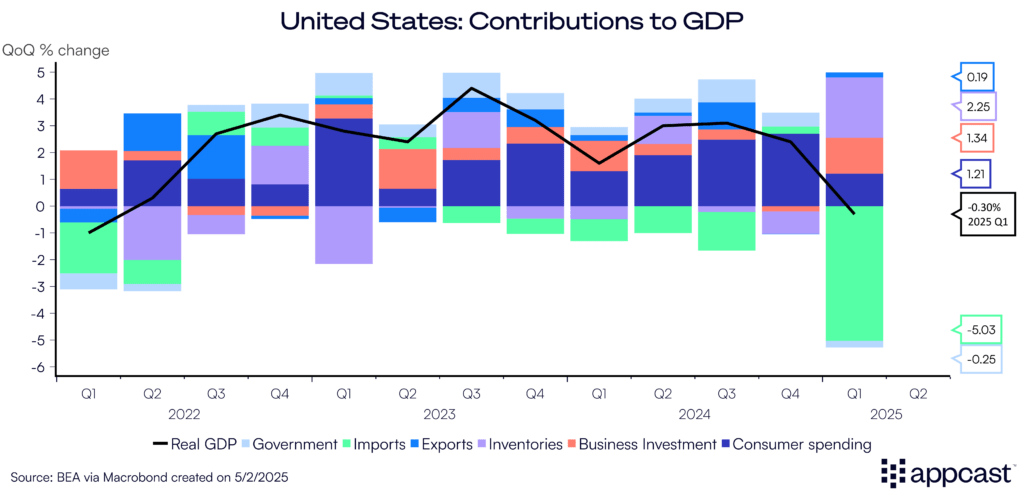 The other main piece of economic news this week was the release of first quarter gross domestic product (GDP). This week’s GDP figure showed the U.S. economy contracted for the first time since the first quarter of 2022, declining -0.3%.