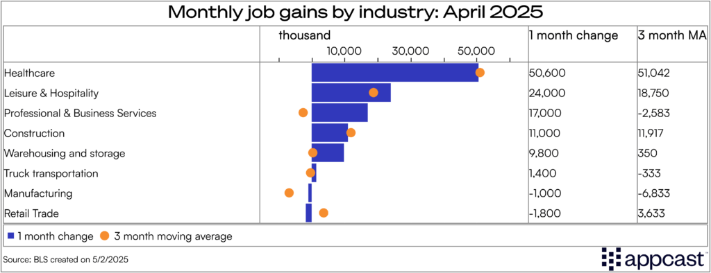 Outside of the supply chain & logistics industries, hiring demand was solid across the board. Healthcare continues to chug along, adding 50,600 new jobs. Despite some warning signs about cooling international and domestic travel, leisure and hospitality added 24,000 jobs.