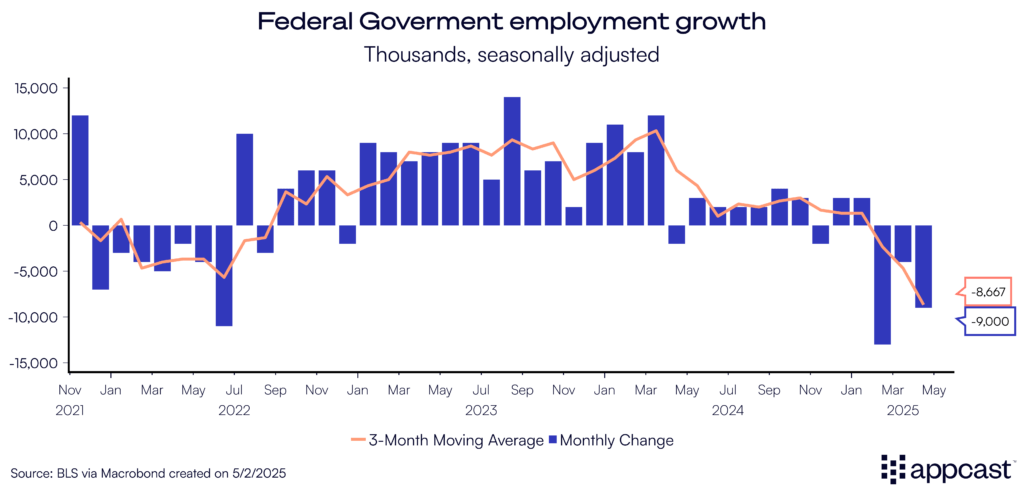 One area of weakness we’ve highlighted before has been the decline in federal government employment, as the sector lost another 9,000 jobs in April. The longer-term strategy to reduce the federal workforce on behalf of the Department of Government Efficiency (DOGE) continues to play out as thousands of workers have been asked to take severance.