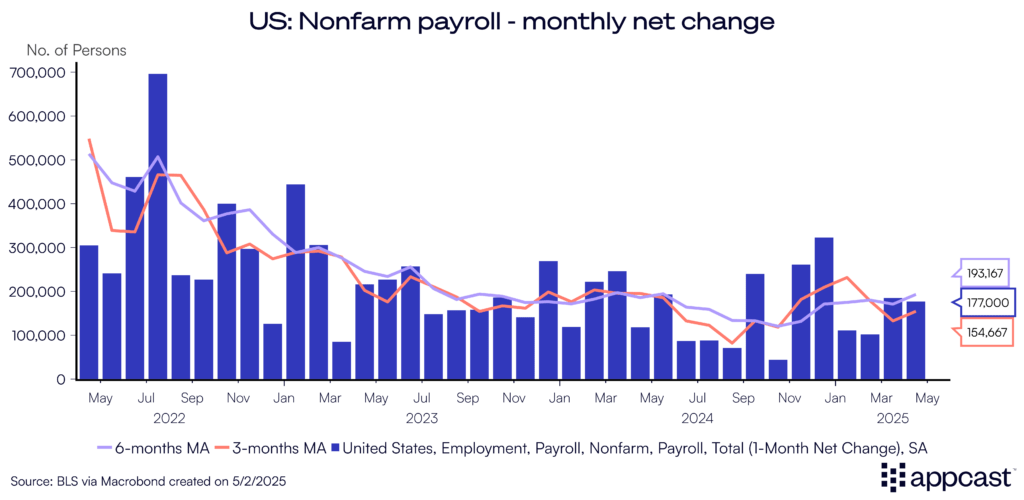 The U.S. labor market continues to show resilience. The U.S. added 177,000 new jobs in April while the unemployment rate stayed fixed at 4.2%. So far, the job market has shrugged off the April 2nd tariff announcements and subsequent whipsawing of financial markets.