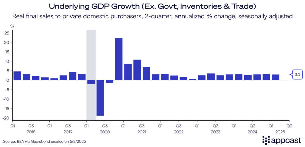 Stripping away the impact of trade data and just focusing on consumer spending and business investment was surprisingly strong, growing at 3% annually.