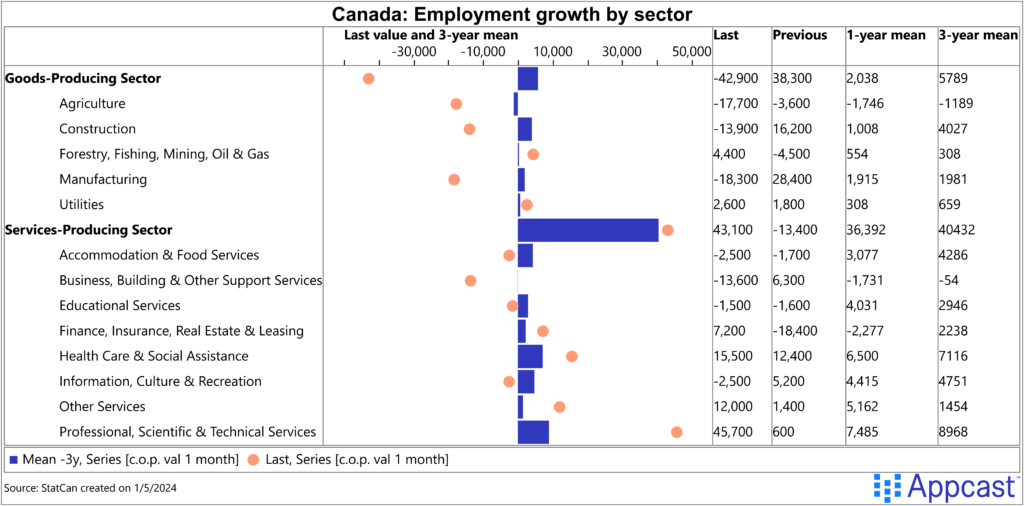 The employment gap between the goods-producing industries and service-producing is massive – the former lost 42,900 jobs last month while the latter gained 43,100. For goods industries, construction and manufacturing drove most of the losses, combining 32,200.