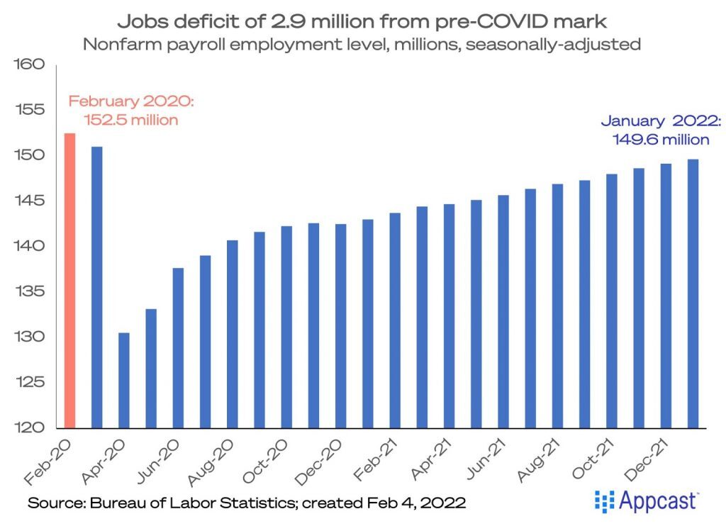 There is still a lot of catching up to do. While the US economy added an upwardly-revised 6.7 million jobs in 2021, compared to 6.5 million pre-revisions, the job deficit compared to pre-pandemic times is 2.9 million, or 1.9% below February 2020 levels. So, despite all the hooray about a strong reading, we’re still nearly 3 million jobs short of where we were.