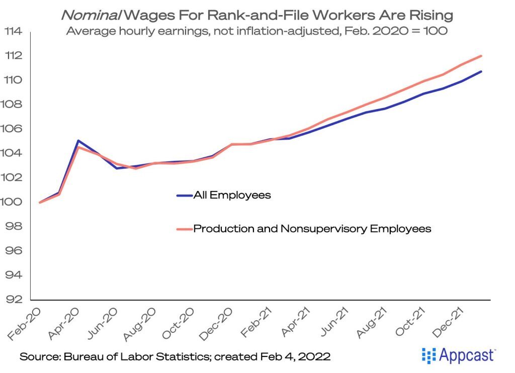 Wage growth continues to be very strong. Average hourly earnings for all workers accelerated to 5.7% year-over-year. Average hourly earnings for rank-and-file workers – production and nonsupervisory employees – were up 6.9% year-over-year. From February 2020, nominal wages are 12.0% higher for rank-and-file employees, and up 10.7% for all workers. But as we all know, these are nominal gains – or not adjusted for inflation – and consumer price inflation is at a 40-year high.