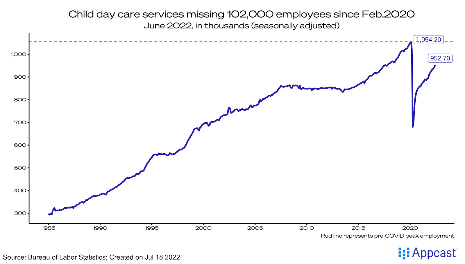 The labor market is strong – employment is low, and many sectors have completely recovered the losses from COVID-19. Some subsectors, however, are still suffering. Child day care services is one and that can have a rippling effect across the labor market.