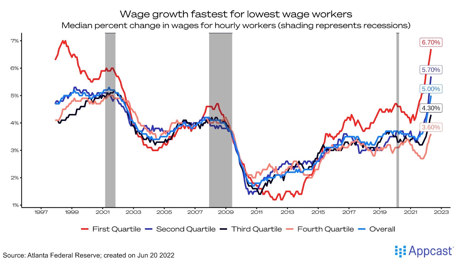 Highlighted in the chart below, wages were up 6.7% for first quartile earners in May 2022, the highest 12-month moving average since 1998. Overall wage growth, for all workers, was 5.0% in May, an impressive rate. These are encouraging figures for workers who have seen rather negligible wage growth in the past decade. However, with inflation at a 40-year high, real wage growth is negative for most workers.