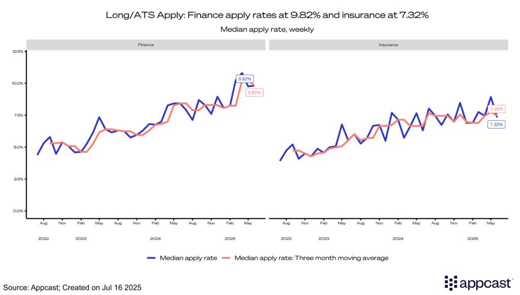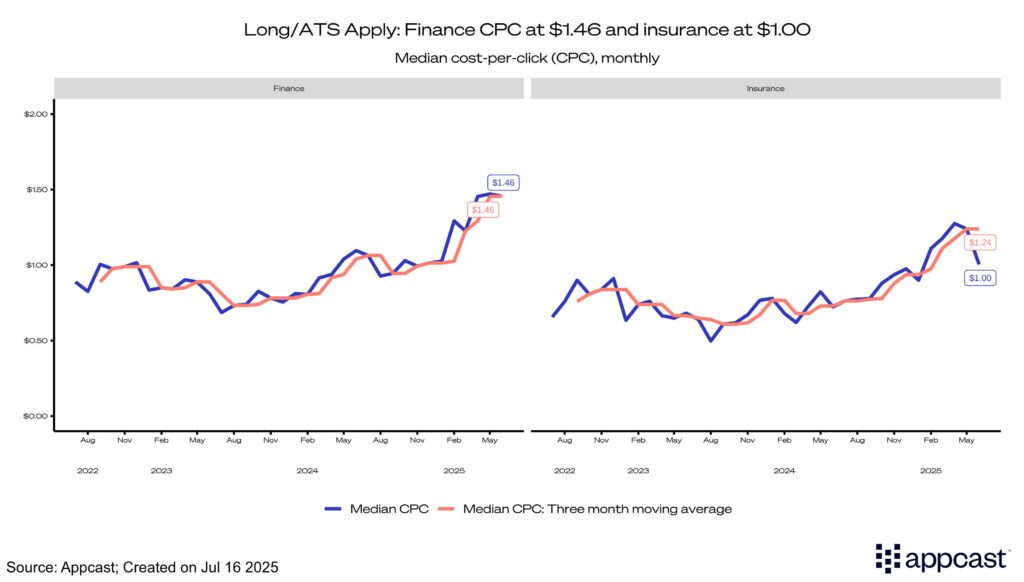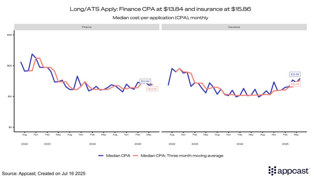 Recruiting costs for insurance also rose in Q2 overall. CPC slightly increased at the beginning of the quarter; however, it decreased to $1.00 in June. The median CPA for insurance continued to rise, coming in at $15.86, while apply rates across both finance and insurance declined—with finance dropping to 9.8% and insurance to 7.3%.