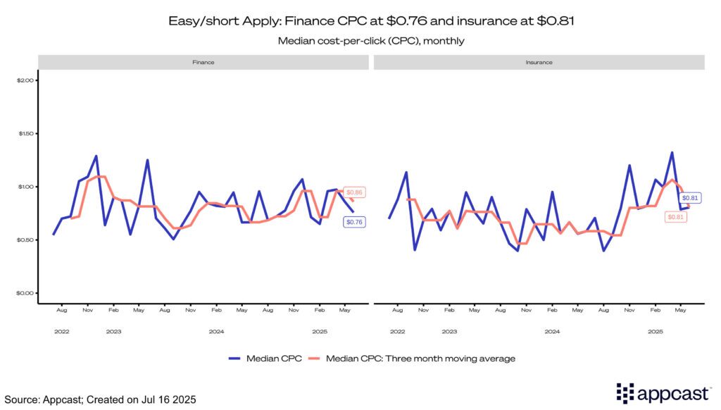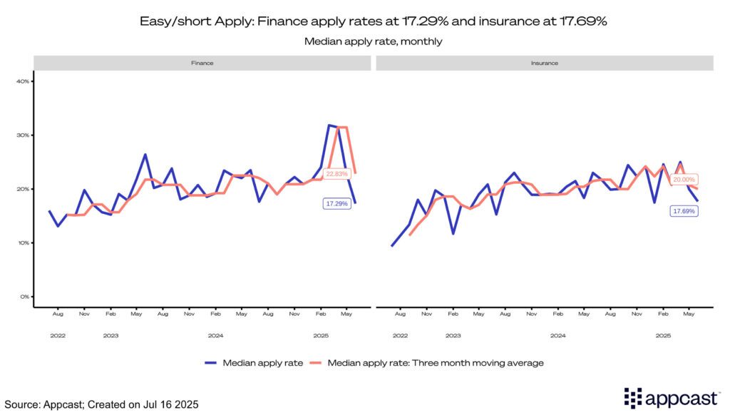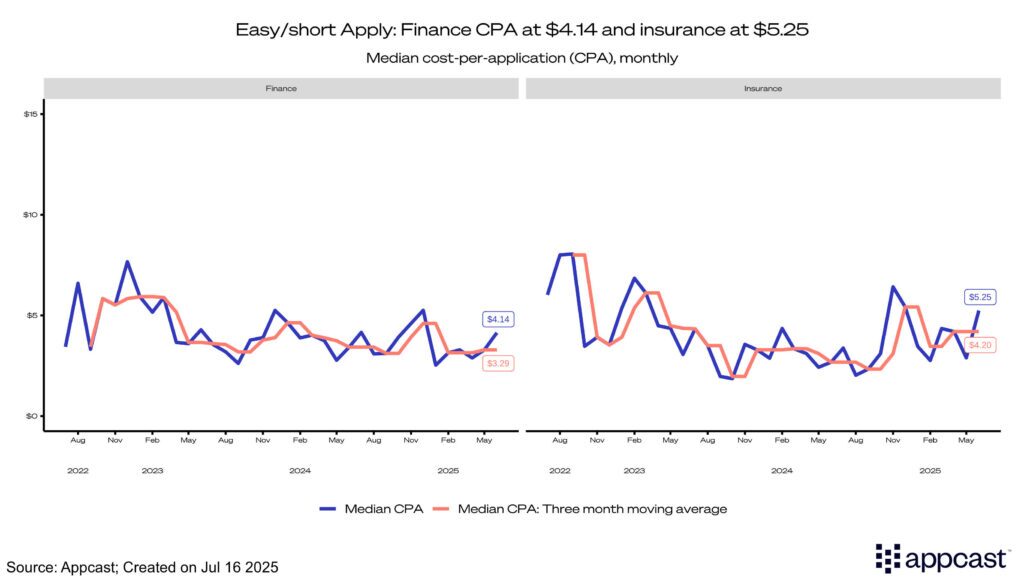 Easy apply CPCs for both finance and insurance decreased over the quarter, with finance ticking down to $0.76 and insurance to $0.81. Finance and insurance also mirrored each other in CPAs, with both seeing similar increases to $4.14 and $5.25, respectively. Apply rates in both finance and insurance dropped to just over 17%, with the apply rate for finance dropping by nearly 15% in Q2.