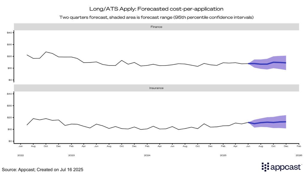 Based on historical CPA data, our forecast predicts that recruiting costs for both sectors will remain stable, with CPAs for finance remaining in the $11 to $14 range and insurance remaining a little higher in the 13$ to $16 range for the rest of the year.