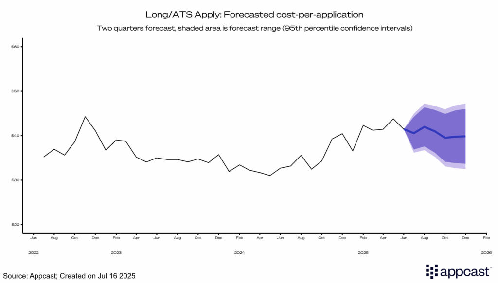Using Appcast’s weekly historical cost-per-application (CPA) data, Recruitonomics has developed a two-quarter forecast for median CPA in the healthcare sector. The outlook points to rising costs, with CPAs expected to return to levels last seen in 2022.